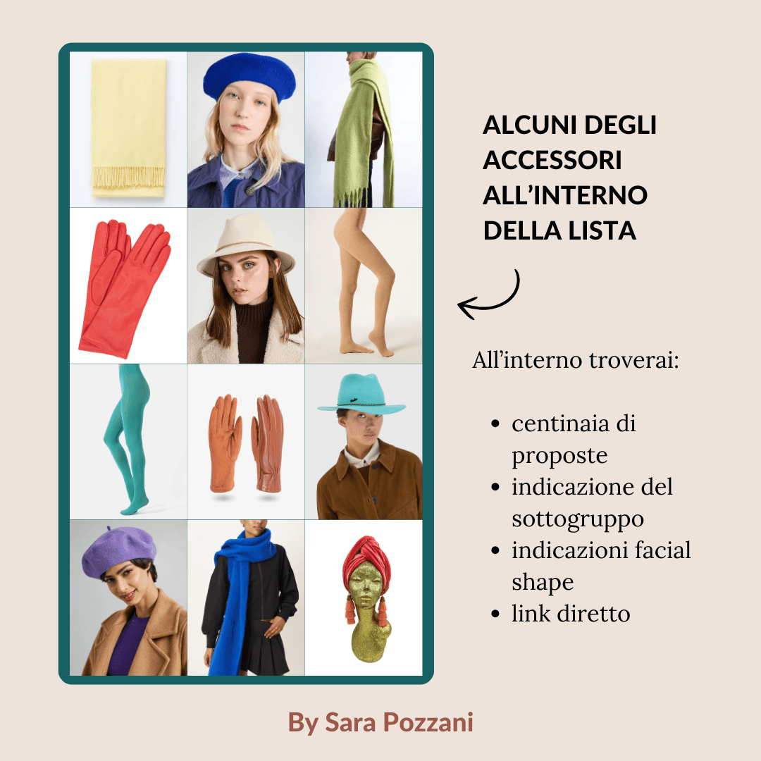 In questa lista shopping dedicata al pubblico femminile della palette Primavera, troverai una selezione di capi curata personalmente da Sara Pozzani, con dettagli specifici su stagione, sottogruppo e body shape, prendendo in considerazione tutti gli stili e tutte le fisicità. L’edizione di questo mese è dedicata agli accessori: guanti, sciarpe, cappelli, turbanti e collant. All’interno troverai una selezione con prezzi che coprono tutte le fasce, da quelle più basse a quelle più alte (da Calliope fino a Max Mara).